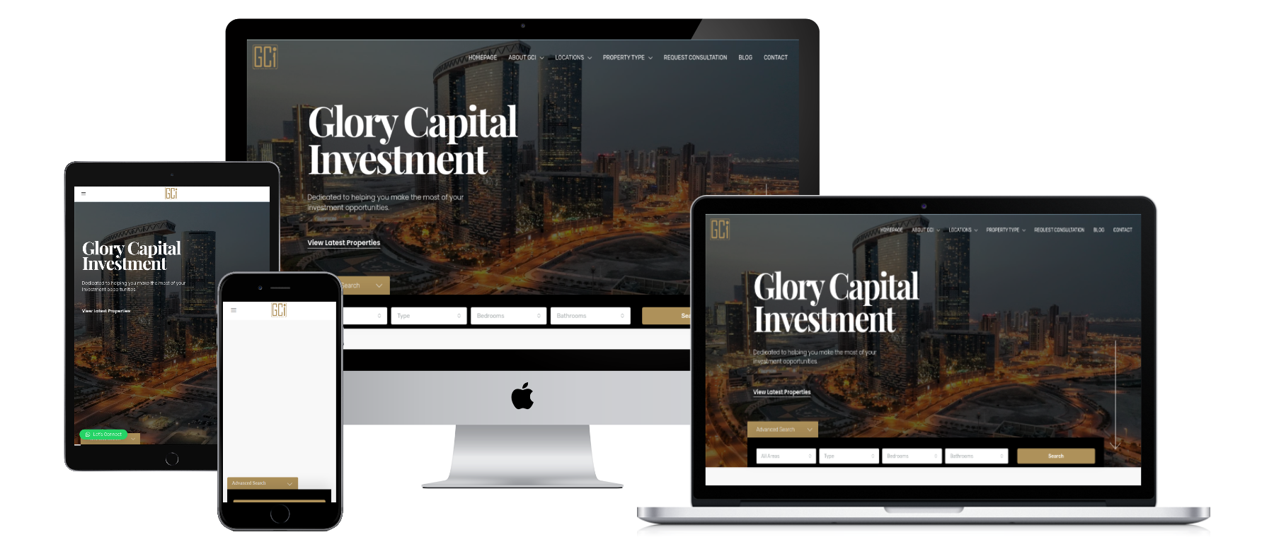 Glory Capital Investment is committed to offering a diverse selection of real estate properties in Abu Dhabi, known as the "City of Opportunity." The website features prominent calls to action (CTAs) and a form to encourage user sign-ups, along with search and filter options for users to easily find properties based on their desired location and specifications.